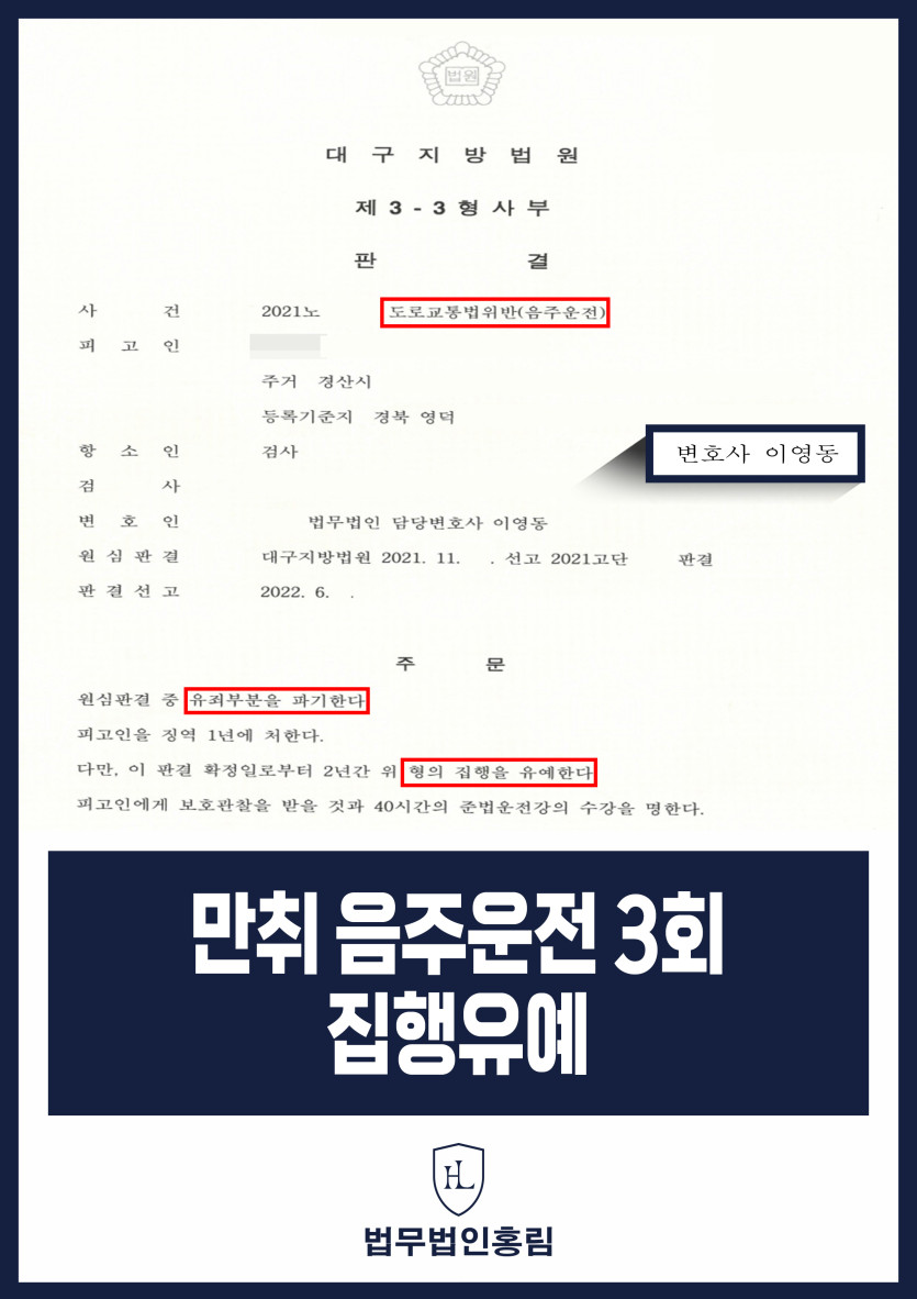 결국 법원은 의뢰인 A씨에게 실형이 아닌 '집행유예' 판결을 선고했습니다. 음주 3회차라는 극히 불리한 조건과 강화된 법적 잣대 속에서도, 홍림은 공소사실 일부 무죄 이끌어냄과 동시에 집행유예라는 최선의 성과를 달성했습니다.