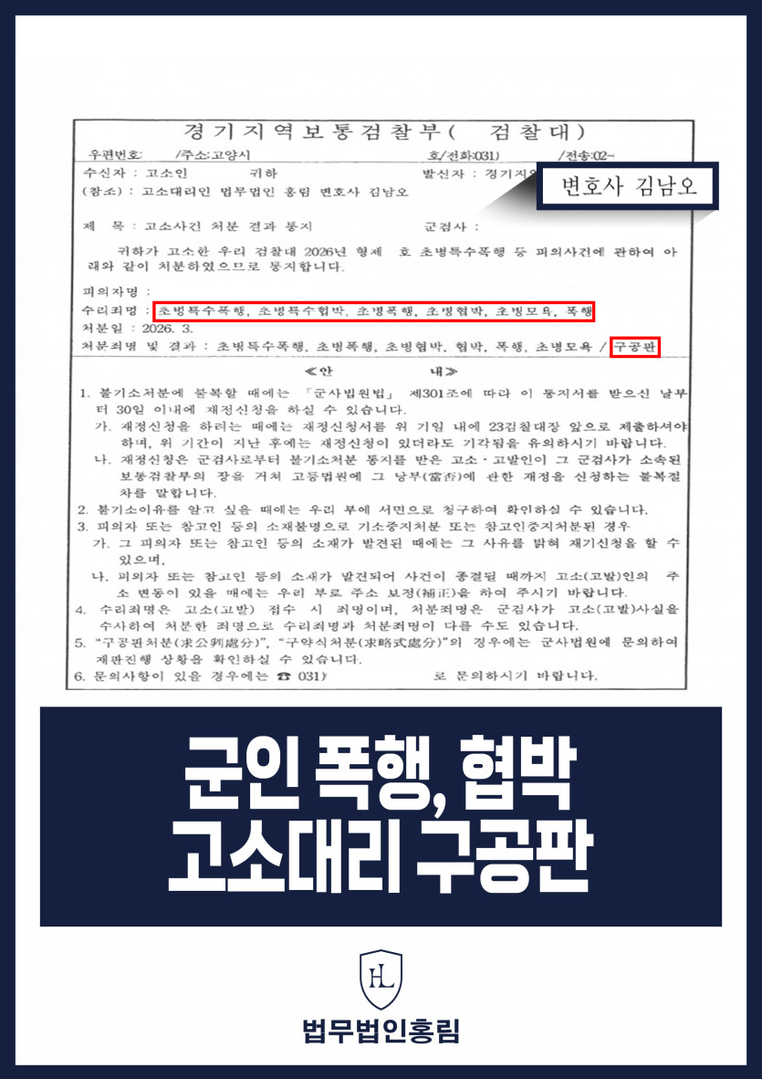 군인 폭행, 협박 고소대리 구공판 - 상급자로부터 당한 초병특수폭행·협박 등 고소해 재판행 성공 2026.03.18