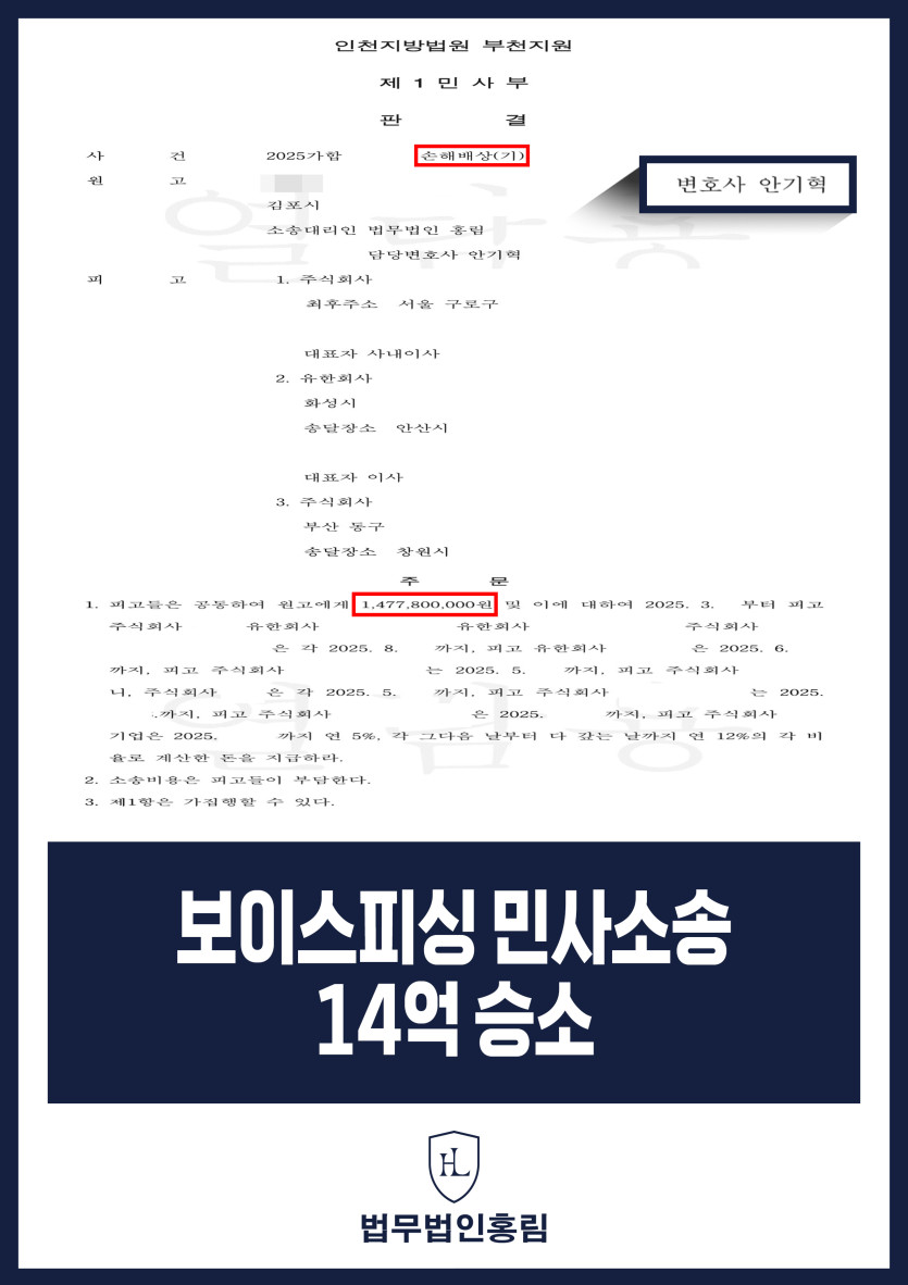 법무법인 홍림의 체계적인 형사·민사 병행 대응 끝에, 법원은 홍림의 주장을 전면 받아들여 상대방이 의뢰인(원고)에게 14억 7천만 원 전액을 지급하고 소송비용까지 부담하라는 완전 승소 판결을 선고하였습니다.
