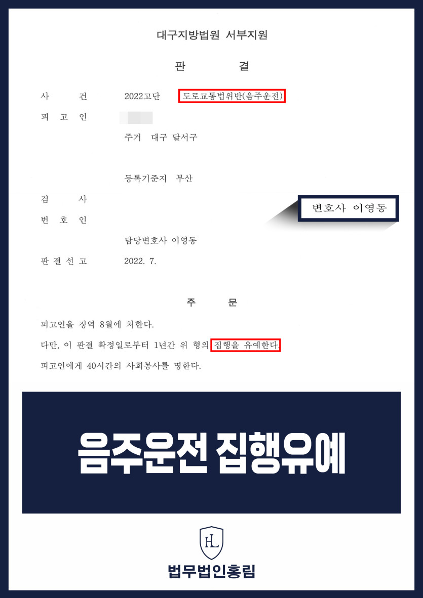 법무법인 홍림의 체계적인 양형 변호 끝에, 법원은 동종전과가 있는 재범임에도 불구하고 의뢰인에게 징역형의 집행유예를 선고하였습니다. 실형이라는 최악의 결과를 피하고 의뢰인이 가정과 직장을 지킬 수 있게 된 것입니다.