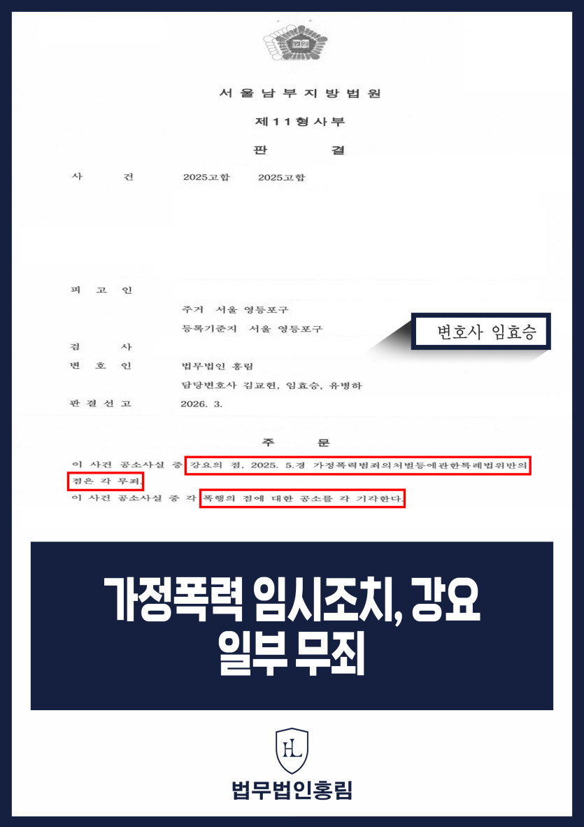 가정폭력 임시조치, 강요 일부 무죄 - 이혼 분쟁 중 제기된 범죄 혐의 일부 무죄 성공 2026.04.15