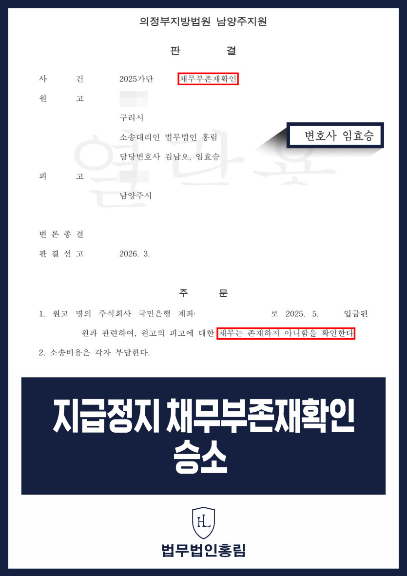 그 결과 법원은 C씨의 채무가 존재하지 않는다는 판결을 선고하였고, 지급정지 조치는 해제되어 C씨는 본인 명의 계좌를 온전히 되찾을 수 있었습니다.