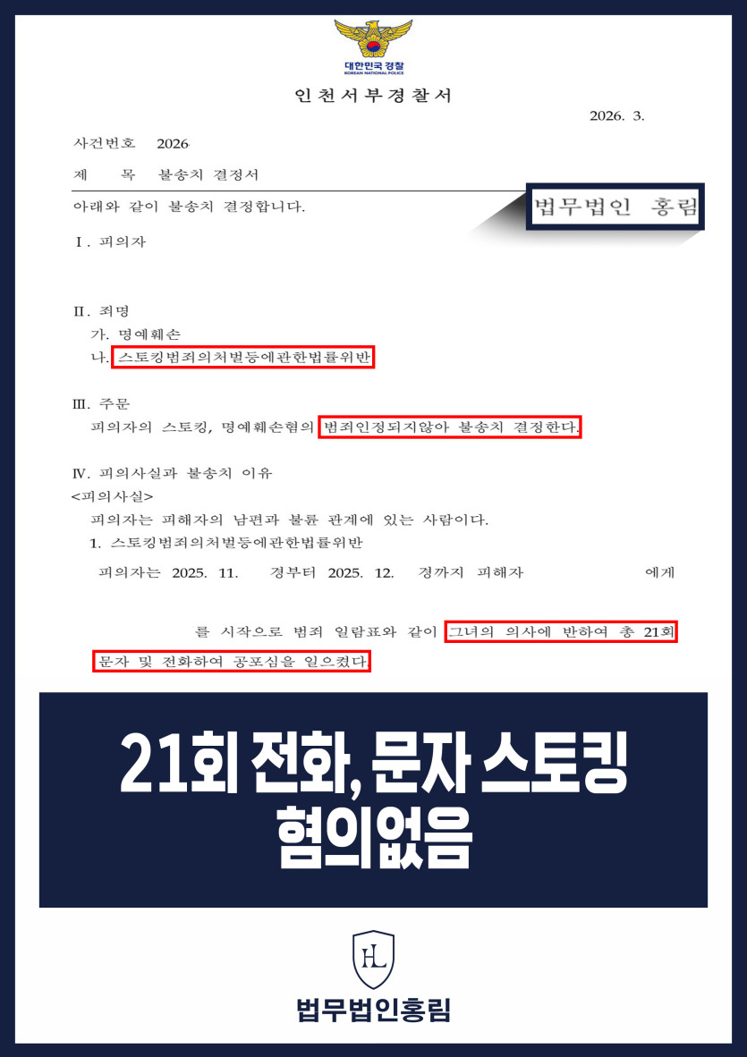 21회 전화, 문자 스토킹 혐의없음 - 상간남의 아내에게 전화, 문자했지만 범죄 불인정 무혐의 성공 2026.04.21