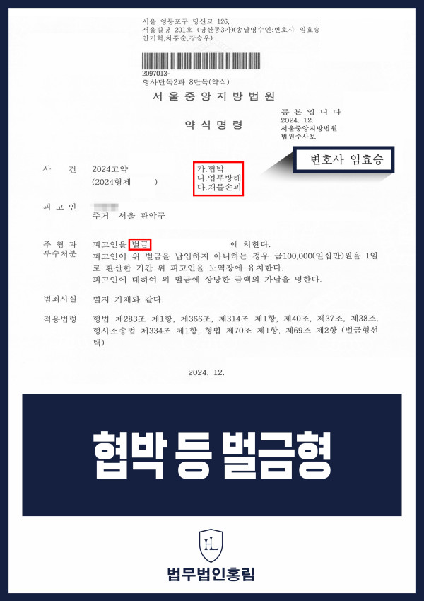 협박, 업무방해, 재물손괴 성공사례 - 수개월 간 직장 내 부하 직원 협박, 업무방해, 재물손괴 벌금형으로 종결 2025.04.21