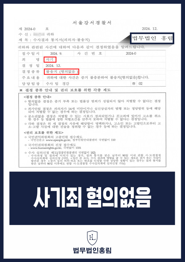 그 결과 경찰 측에서는 변호인의 의견을 받아들여 사건을 '혐의없음(증거불충분)' 처리 하였습니다.