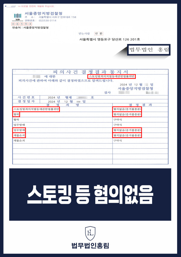 그 결과 검찰 측에서는 변호인의 의견을 받아들여 사건을 스토킹 등 '혐의없음' 처리 하였습니다.