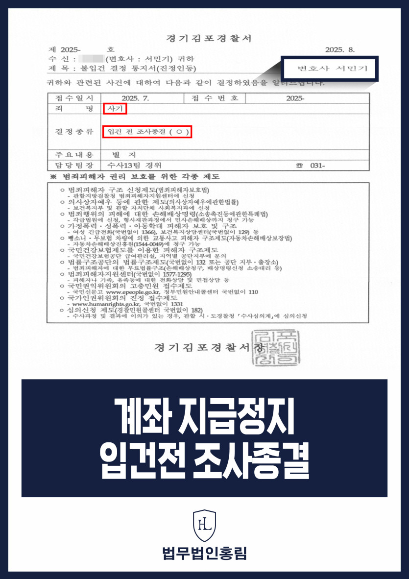 계좌 지급정지 입건전 조사종결 - 보이스피싱 계좌 지급정지 되어 경찰 조사, 변호인 조력으로 불입건 종결 2025.10.30