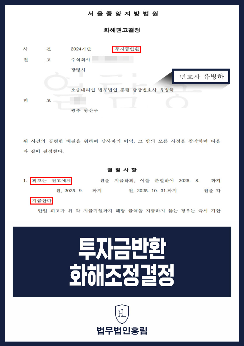 변호인의 철저한 증거 수집과 전략적인 협상 덕분에, 상대방은 소송에서 불리한 상황임을 인정하고 변호인이 제시한 화해조정안을 받아들였습니다. 법원은 양측의 합의 내용을 바탕으로 투자금 반환 화해조정 결정을 내렸습니다. 이로써 의뢰인은 소송이 장기화되는 것을 피하고 신속하게 투자금 전액을 반환받을 수 있었습니다.