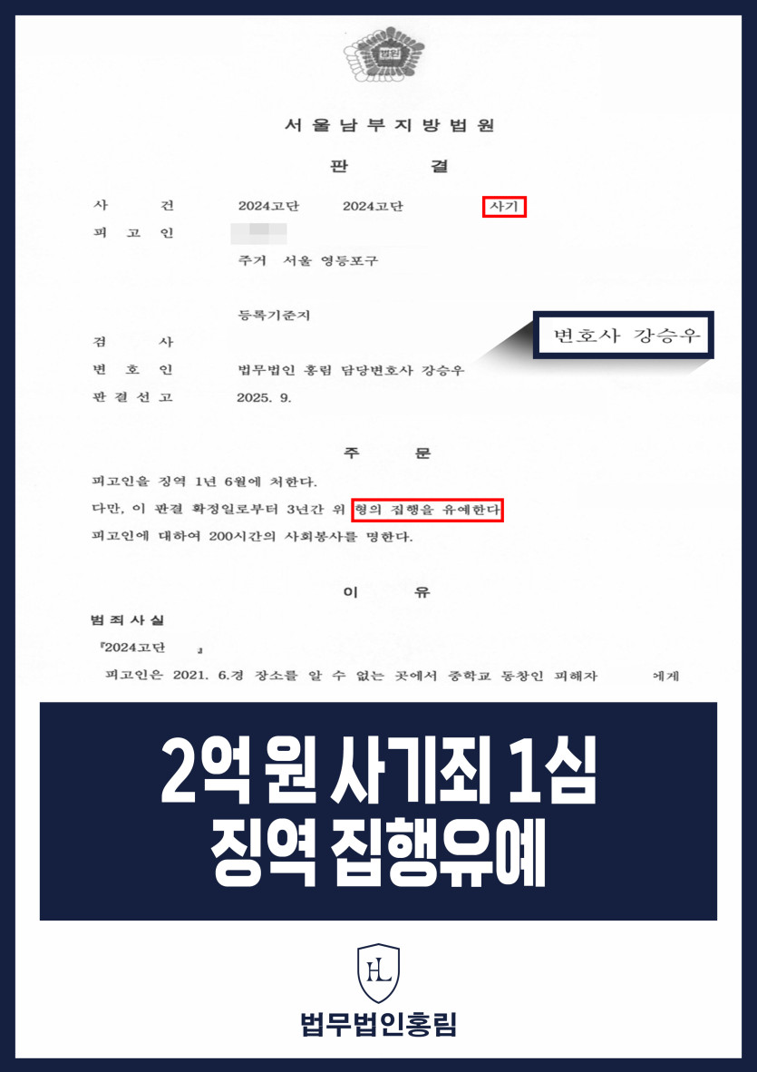 2억 원 사기죄 1심 징역 집행유예 - 동창생, 직장 동료 등 다수에게 돈 빌렸으나 선처 이끌어내 집행유예 성공 2025.12.03