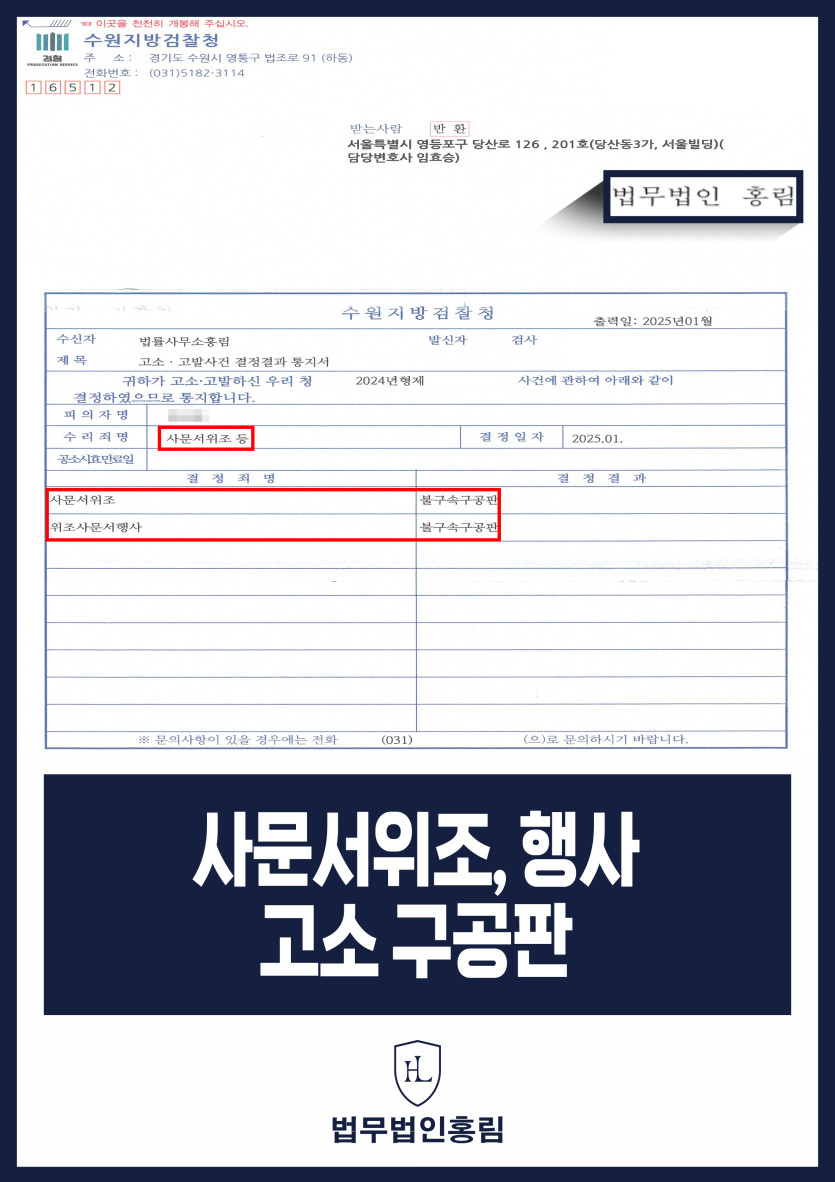 따라서 검찰은 피고소인을 사문서위조,행사에 대한 범죄 행위를 인정하여 '구공판(재판 회부)' 을 결정하여 의뢰인은 고소에 성공하였습니다.