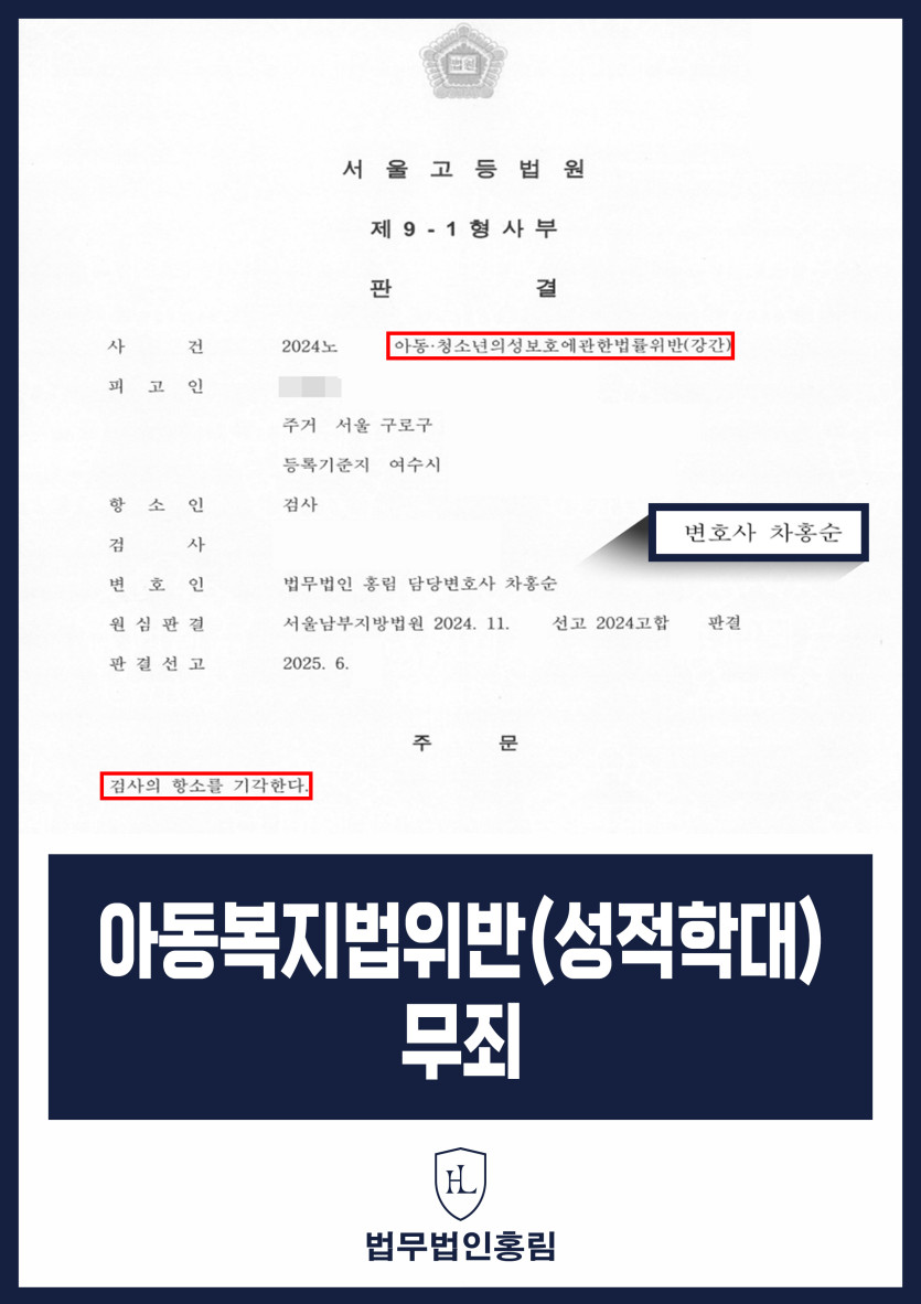 아동복지법위반(성적학대) 무죄 - 커뮤니티에서 만난 미성년자 간음 사건 항소 기각 성공 2025.06.30