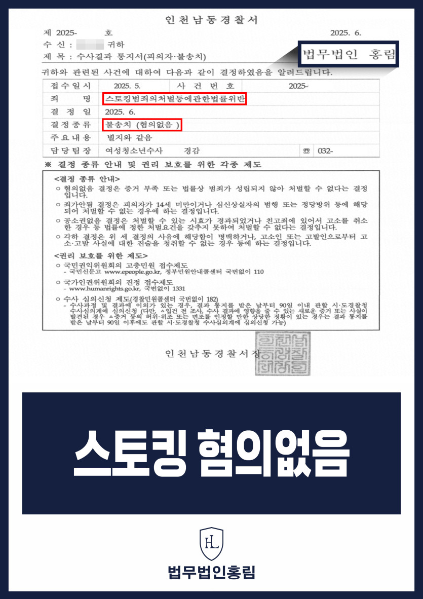 스토킹 혐의없음 - 헤어지는 과정에서 메시지 보냈다가 스토킹 신고 당했지만 변호인 조력으로 사건 종결 2025.06.20