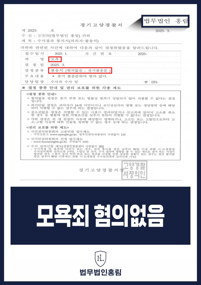 모욕죄 혐의없음 - 이웃과 주차 문제로 시비 붙어 모욕죄로 고소당했지만 무혐의 종결 시킨 사례 2025.06.16