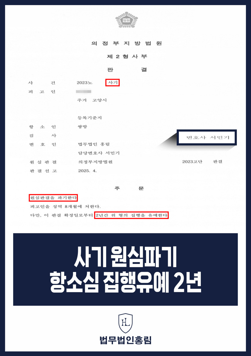 사기 원심파기 항소심 집행유예 2년 - 1심에서 실형 선고 받았지만 변호인 조력으로 집행유예로 승소 이끈 사례 2025.06.16