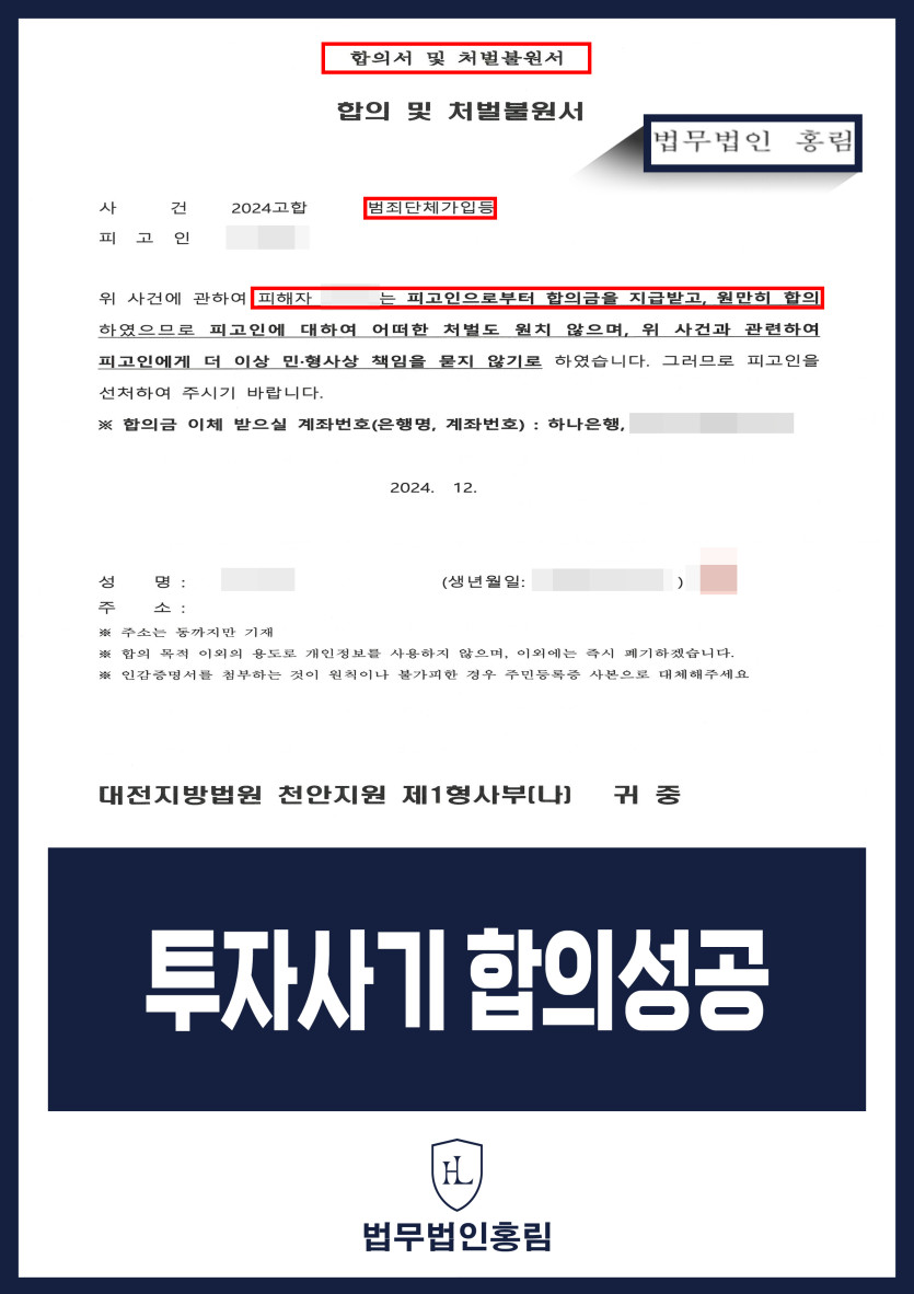 투자사기 합의성공 - 가상화폐 투자사기 피해자 대리해 조직원 구공판 성공 후 합의 이끌어낸 사례 2025.06.16